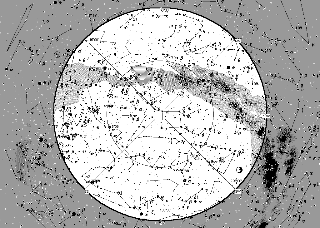 In the beginning November orientation of the animation, the bottom one-half of your field of view is relatively empty of dust, gas and stars towards the South Galactic Pole near alpha Sculptor near the bottom or south horizon of the screen. Galaxies in this unobscured region around the South Galactic Pole can be viewed. The Milky Way appears as an east-west running band. This is the Perseus Arm - the next arm out in our spiral galaxy. Amateurs search for intra-galactic objects in that arm of the Milky Way, such as planetary nebula, open clusters, and darka and bright nebula.