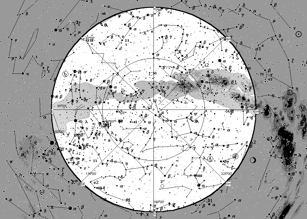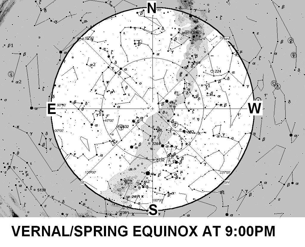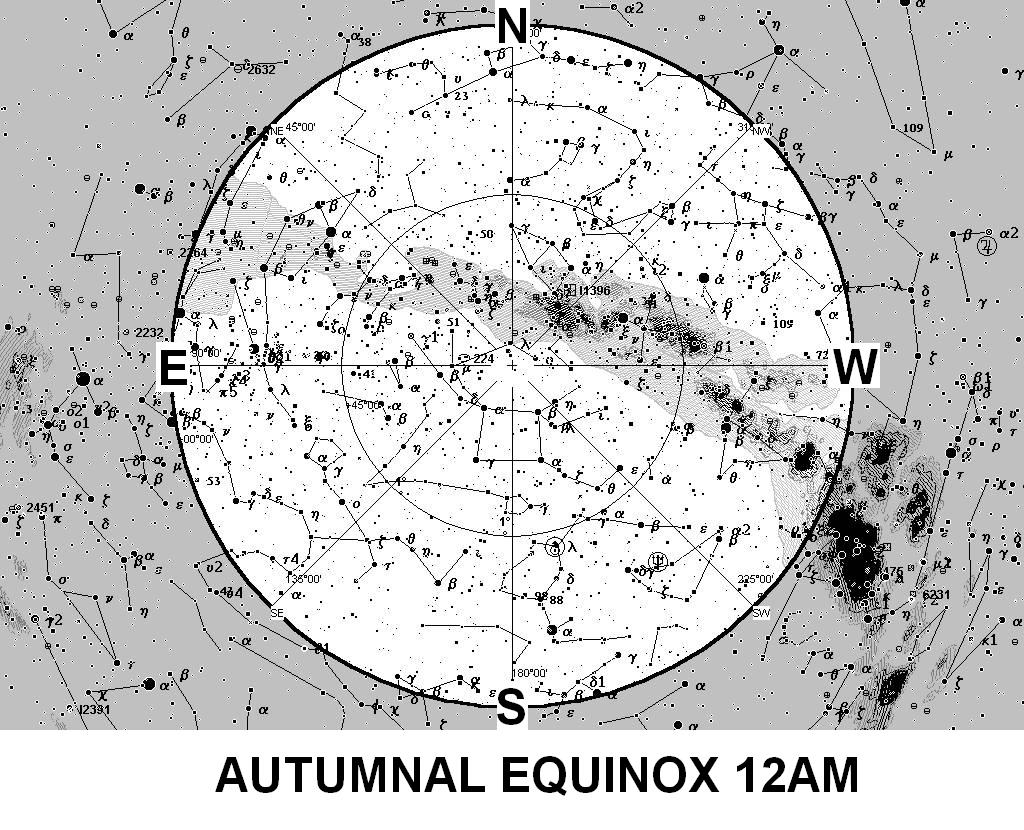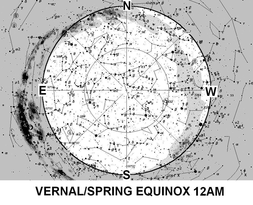 The following are 360 degree altitude-azimuth charts of the night sky at 12 midnight and 9pm at the equinoxes and the solstices, generated using Cartes du Ciel: