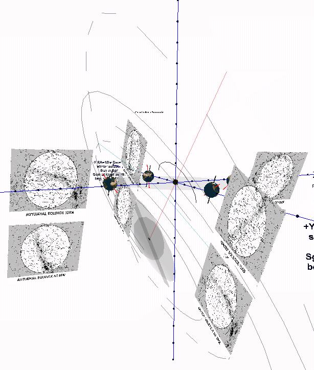 The change in apparent orientation of the galactic plane between the equinoxes and solstices is illustrated in the following animations.