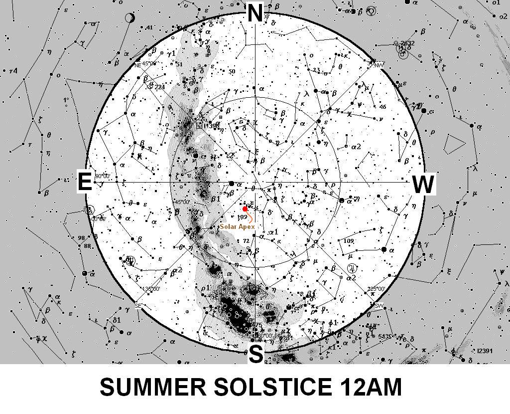 The solar apex - the apparent direction of travel of the Earth within the Milky Way - in the constellation Hercules appears in Figure 3, Summer Solstice at 12AM, and in Figure 8, Autumnal Equinox at 9PM, above. In the spring at midnight, amateurs can look "up" and "out" the "top" of the Milky Way's plane and have a relatively unimpeded view of distant galaxies. Figure 2. At the summer solstice at midnight, rich star fields that are dense with gas clouds and open clusters in the galatic plane towards the galactic core (galactic longitude 0 degrees) are visible. The "spinward" portion of our local Orion-Cygnus galactic arm is visible through 90 degrees galactic longitude. Figure 3. |