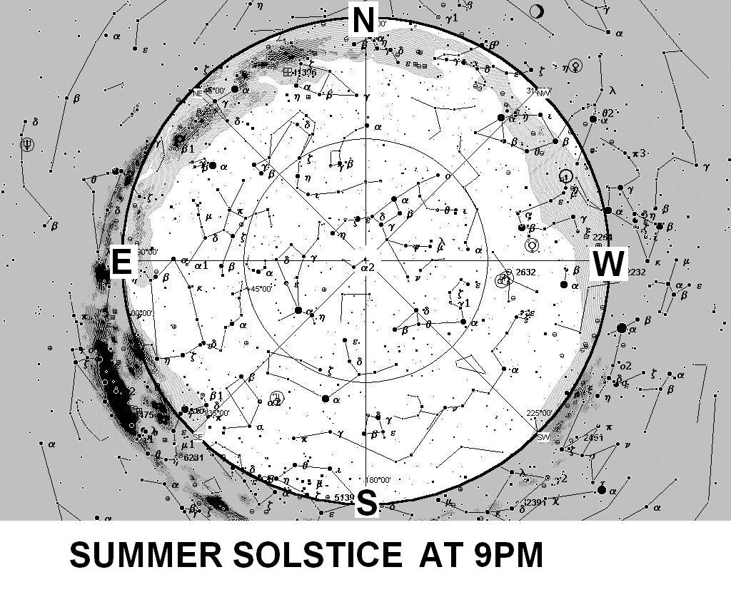 The orientation of the Earth in its orbit relative to the galactic plane is best understood by taking mental snapshots of the night sky at midnight at the equinoxes and the solstices. However, most amateurs are used to seeing the night sky at 9pm local time. The Earth's daily rotation also effects the apparent orientation of the Milky Way to the observer. In the foregoing figures, the night sky as seen at midnight and 9pm local time are illustrated. Comparing Figures 2-7 and 5-6, there is an evident pattern. The sky at midnight at the spring equinox (Figure 2) looks nearly identical to the sky at 9pm on the summer solstice (Figure 7). Similar pairings are seen for the other equinoxes and solstices. Figures 3 and 8, and 4 and 9.