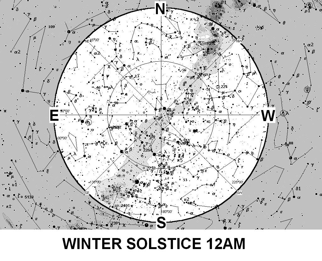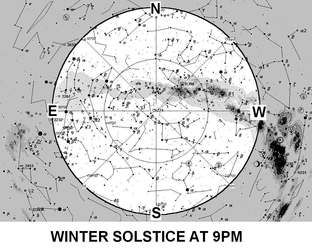 At the autumnal equinox, the amateur can see portions of the Perseus Arm stretching east to west along the local zenith from Cygnus (90 degrees galactic longitude) to Gemini (~180 degrees galactic longitude). Figure 4. But the observer can also see "down" and "out" the Milky Way's plane towards the south galactic pole - into a relatively star free region and towards distant galaxies in the constellation Fornax. Figure 4. At the winter solstice, the amateur again sees the rich star fields full of open clusters and nebula, like M42 in Orion, all contained in the Milky Way's galactic plane. Figure 5. Near the winter solstice, the northern observer sees from the galactic anti-center near Gemini towards galactic longitude 270 degrees in the constellation Vela. This portion of the sky, near Canis Major, also contains the "unwinding" or "antispinward" portion of our local Orion Cygnus Arm.