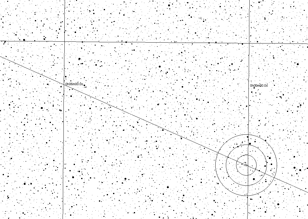 In the second simulation at a 41N observing point, the observer is looking at the spring equinox or the First Point in Aries, which on the vernal equinox is high in the night sky at the intersection of the celestial equator and the ecliptic. The bulls eye marks the fundamental point of the equatorial system (the intersection of the celestial equator and the ecliptic at RA 0h0m0s Dec 0d0m0s) on September 21, 1956 at 9:00pm. The FOV is approximately 1.5° by 2.5°. Stars are plotted to a deep magnitude 18 in order to provide visual frame of reference. As the simulation proceeds there is slight annual shift in the TFOV orientation due to my inability to find within the planetarium software a precise setting that would maintain a fixed field of view. The simulation progresses in one calendar year plus 56 second increments for the next 89 years. General precession, which moves at approx. 50" per year, is illustrated by watching how the central 1' arcmin bull's eye moves slightly away from the current year's spring equinox. The three brightest stars in the bull's eye are HD224958 (v9.1), HD224876 (v9.2), and HD224934 (v9.4).