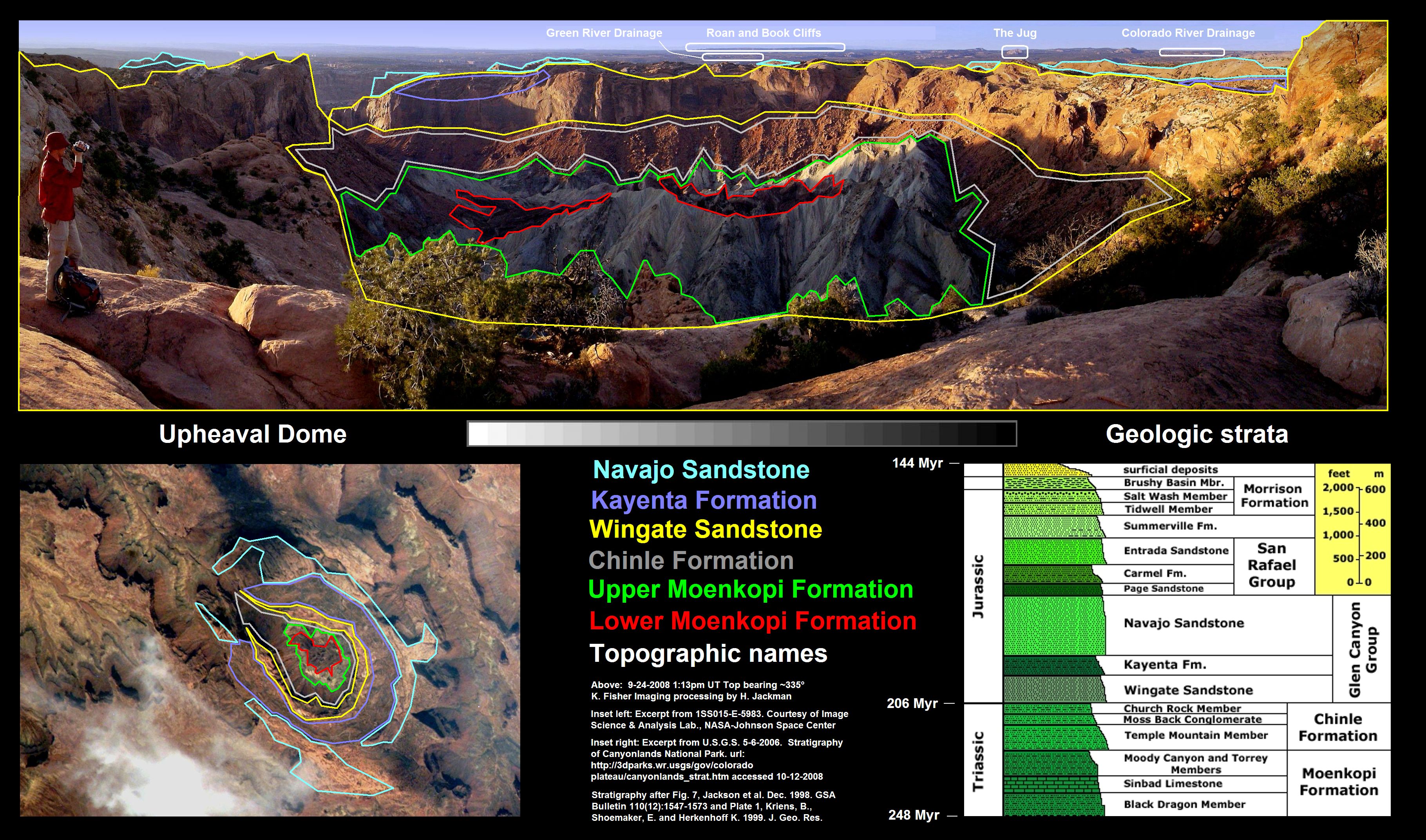 In March 2008, Thomas Kenkmann, a geologist with Humboldt University in Berlin (after six years of research), and Elmar Buchner of the University of Stugggart, provided conclusive evidence that the Upheaval Dome, an impact-shaped feature in Canyonlands National Park, Utah, was caused by a meteor strike. Buchner and Kenkmann located planar deformation features (PDFs) in quartz crystals embedded in the outer sandstone ring of this two ring crater. PDFs are microscopic fractures in quartz crystals that correlate with the intensity of a shock impact experienced by the cyrstal. These PDFs evidence a shock wave greater than 10 gigapascals travelled through Upheaval's sandstone outer ring, unambigously showing a shock generated wave of non-terresterial origin. The feature that we see today is not the original 170 million year old impact crater. The original crater was around 8 kilometers in diameter and extended between 1 and 2 kilometers above the south rim view area shown here. 155 million years ago, Upheaval Dome probably looked something like the 4 kilometer diameter Steinheim Basin in Bavaria, or the 2.5 kilometer blown-sand filled Roter Kamm Crater in Nambia. Subsequent uplift and erosion removed this overburden, leaving this unique 3 kilometer diameter dissection of what the geologic layers might look like at or beneath the surface of an analogous lunar complex crater such as Triesnecker. Several traces of the impact are seen in rock from the south rim view area: a fractured Kayenta layer, radial faults in the inner ring wall, 30 meter tall displaced blocks, verge or circular faulting in the central uplift and melted sandstone dikes near the impact center.